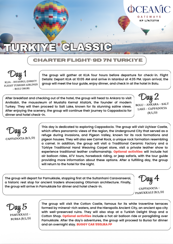 Join a 9-day Turkey tour from Kuala Lumpur with Oceanic Gateways Travel & Tours. Explore Istanbul, Cappadocia, Pamukkale, and Bursa with guided tours, hot air balloons, and cultural experiences.